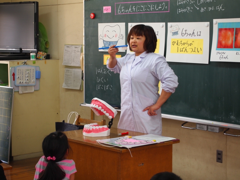 保健室の山本先生による歯みがき指導です。王様みがきでピカピカにしよう