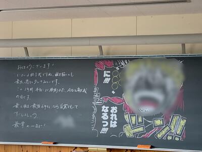 ※下の写真は、その修了式朝の5年生教室黒板に描かれた「学級担任から子どもたちへのメッセージ」です。