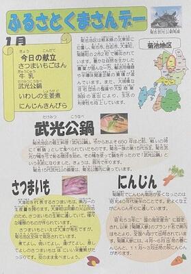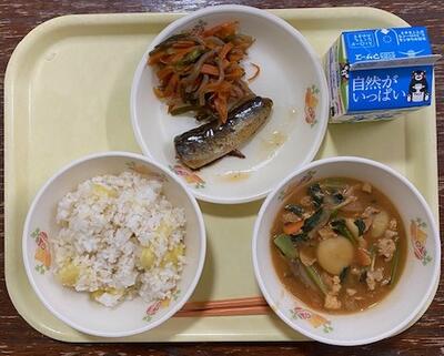 今日は、ふるさとくまさんデー(菊地地区)です。今日の献立は、「さつまいもご飯、武光公鍋、いわしの生姜煮、人参きんぴら、牛乳」です。さつまいもご飯は、おいもの甘みを感じ美味しくいただきました。武光公鍋は、お肉やお団子等の具材が味よく、ご飯ともよくあいます。いわしの生姜煮は、柔らく食べやすく、人参きんぴらは、噛むほどに美味しいさを感じました。今日もおいしい給食ありがとうございました。