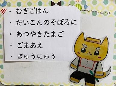 今日は、キャロッピーデー「だいこん」です。今日の献立は、「麦ご飯、大根のそぼろ煮、厚焼きたまご、ごまあえ、牛乳」です。大根のそぼろ煮は、大根に味がよく染みていて、柔らかくて、他の具材の味もよく、ご飯も進みます。厚焼きたまごは、甘くて美味しい。ごまあえは、野菜の美味しさを、噛むほどに味わえました。後期前半も明日と、明後日まで、今日は冬至です。寒い日が続きます。今日もおいしい給食ありがとうございました。