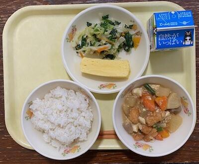 今日の献立は、「麦ごはん・根菜のみそ汁・豚肉の中華炒め・ひらつくね・牛乳」です。みそ汁には、小松菜などの根菜の他に、さつまいもが入っていて、さつまいもの甘さがなんとも言えず、おいしかったです。中華炒めには豚肉以外にもれんこんやピーマンが入っていて、サクサクッとかみ応えも楽しい献立でした。今日もおいしい給食、ごちそうさまでした。