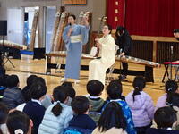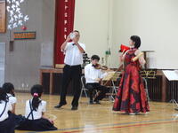 歌、ピアノ演奏、空手、音楽に合わせてバスケット、けん玉、マジック、紙芝居、書道など、得意技を披露しています。