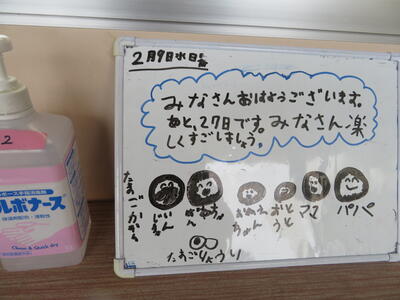 2年生の教室前には、子どもたちが書いたホワイトボードが飾ってあります。