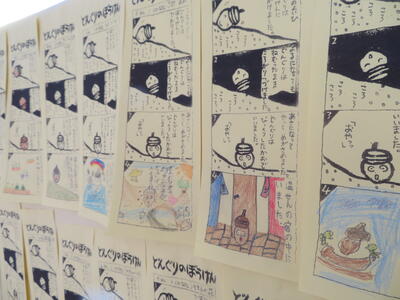 図書委員会の「おはなし作りコンテスト」に応募した子どもたちや先生方の作品が図書室前に掲示されました。