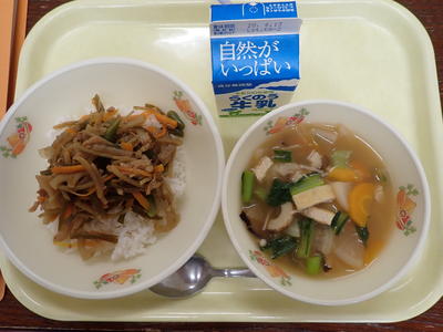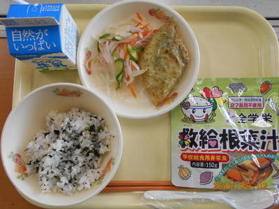 わかめごはん、きゅうきゅうこんさいじる、おさかなのてんぷら、マロニーのあえもの