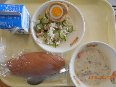 げんまいパン・さつまいものクリームシチュー・スコッチエッグ・ひよこまめのサラダ