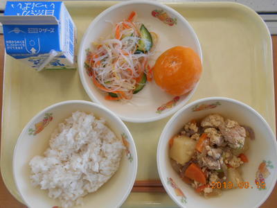 むぎごはん・おやこに・はるさめのあえもの・れいとうみかん