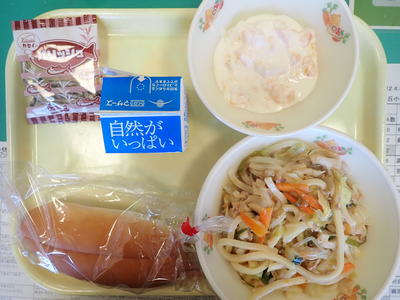 セルフフルーツクリームサンド、焼きうどん、一色いりこ、牛乳