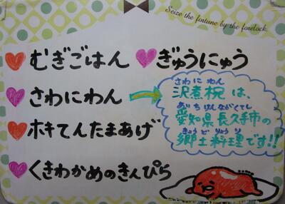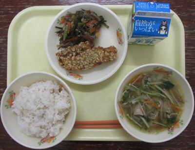 今日の献立は、「麦ご飯、さわにわん(沢煮椀は、愛知県長久手市の郷土料理)ホキてんたまあげ、くきわかめのきんぴら、牛乳」です。沢煮椀(さわにわん)は、沢山の千切り具材がお汁と絡んでいて、とても美味しいです。千切り野菜の食感もよく、ご飯ともよく合います。ホキてんたまあげは、サクッとした食感でホキは柔らかくて美味しいです。くきわかめのきんぴらは、コリコリ、うまうまです。今日もおいしい給食ありがとうございました。