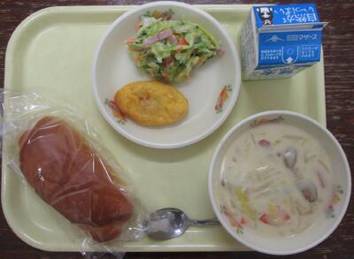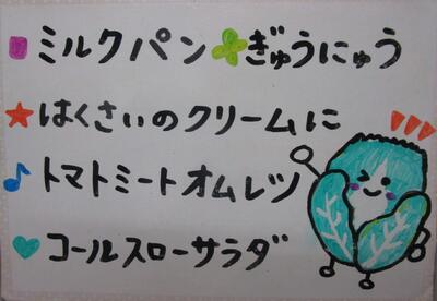 今日の献立は、「ミルクパン、白菜のクリーム煮、トマトミートオムレツ、コールスローサラダ、牛乳」です。白菜のクリーム煮は、白菜がとろりと柔らかく、他の具材も柔らかくて美味しくいただきました。トマトミートオムレツは、みんな大喜び。そして、コールスローサラダ、野菜を沢山いただきました。今日もおいしい給食ありがとうございました。