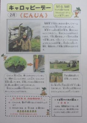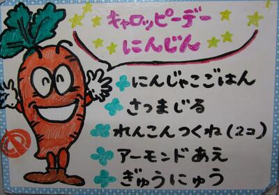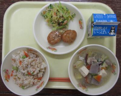 今日は、キャロッピーデー2月「にんじん」です。献立は、「にんじゃこご飯、さつま汁、れんこんつくね(2個)アーモンドあえ、牛乳」です。にんじゃこご飯は、枝豆、人参と色鮮やかで、じゃこも味よく、美味しくいただきました。さつま汁は、人参の色が鮮やかで、さつまいも、こんにゃく、お豆腐、お肉とそれぞれの食感を楽しみながらいただきました。れんこんつくねとアーモンドあえは、それぞれ、れんこんとアーモンドの食感がうれしく美味しい。今日もおいしい給食ありがとうございました。