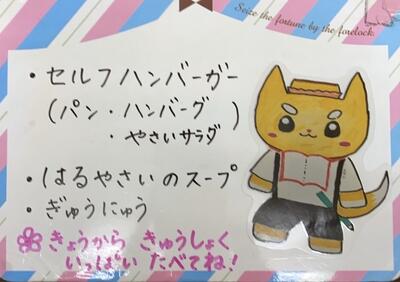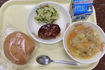 令和7年度初回・今日の献立は、「セルフバーガー(パン・ハンバーグ・野菜サラダ)・春野菜のスープ・牛乳」です。今日から2年生〜6年生の給食が始まりました。(1年生は来週14日からです。お楽しみに!)給食室の先生方が、子どもたちのすこやかな成長のために、心をこめて作っていただく〜本当にありがとうございます。春野菜のスープは具沢山で、おいしかったです! ハンバーガーは、野菜をはさんで食べると、いっそう食べやすかったです。野菜が苦手な子も、これならおいしくチャレンジしてくれるでしょうね! 今日も、ごちそうさまでした♪ そして、このページを日々ご覧いただいているみなさん、令和7年度も武小・給食をお楽しみに