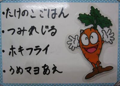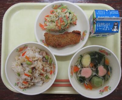今日の献立は、「たけのこごはん、つみれ汁、ホキフライ、うめマヨあえ、牛乳」です。たけのこごはん、たけのこのシャキッとした食感とごはんのモッチリ感がうれしい一品、枝豆や沢山の具材も嬉しく、美味しくいただきました。つみれ汁は、お野菜つみれの彩りよく、味よく、おいしい。たけのこごはんとよくあいます。ホキフライは、サクッ、フワッ、サクッ、フワッと止まらない美味しさ。うめマヨあえは、野菜が食べやすい大きさで、うめマヨとよく絡んでいて美味しい。牛乳も美味しくいただきました。今日もおいしい給食ありがとうございました。