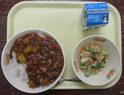 今日から1年生の給食スタートです。武蔵ヶ丘小学校の給食は、とても美味しいです。毎日楽しみですね。今日の献立は、「ポークカレーライス、アスパラサラダ、牛乳」です。ポークカレーライスは、ジューシーなお肉を味わえる旨味たっぷりのカレーです。アスパラサラダは、色味よくアスパラの緑が春を感じさせ、他の野菜もたっぷりで、食べ応えあるサラダです。給食の先生方をはじめ、生産者の皆様や多くの方々の愛情がいっぱいのおいしい給食です。1年生のみなさん、お家に帰って、今日の給食の感想をお話してくださいね。今日もおいしい給食ありがとうございました。