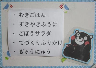 今日の献立は、「麦ご飯、すき焼き風煮、ごぼうサラダ、手作りふりかけ、牛乳」です。すき焼き風煮は、お肉の美味しさ、野菜の美味しさ、マロニーやこんにゃくの食感もよく、ご飯がすすみます。ごぼうサラダは、ごぼうが食べやすく食べ応えありのサラダです。手作りふりかけは、サクッと香ばしい、食べ続けたい美味しさ、元気になります。2月がスタートしました。今月もお世話になります。今日もおいしい給食ありがとうございました。