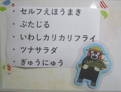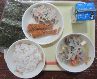 今日の献立は、「セルフ恵方巻・ぶた汁、いわしカリカリフライ、ツナサラダ、牛乳」です。今日は節分です。献立に恵方巻が登場です。今年の恵方は調べてみると南南東だそうです。願い事を思い浮かべながら、美味しくいただきました。いわしカリカリフライ、ツナサラダをのりで巻いて楽しい節分の日の給食でした。ぶた汁もゴボウやさといも、お豆腐と美味しくいただきました。今日もおいしい給食ありがとうございました。