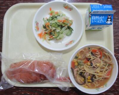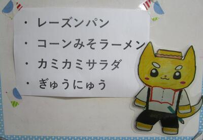今日の献立は、「レーズンパン、コーンみそラーメン、カミカミサラダ、牛乳」です。コーンみそラーメンは、スープとめんがよく絡んでいて、きくらげやもやしの具材も美味しく食感がよいです。カミカミサラダは、かむほどに美味しくなる野菜いっぱいのサラダです。今日もおいしい給食ありがとうございました。