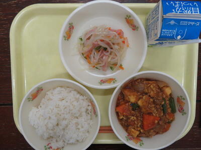 今日の献立は、「麦ご飯、マーボー春雨、海藻サラダ、牛乳」です。マーボー春雨は、旨味をたっぷり吸った春雨やたけのこ等の具材の味がよく、ご飯がすすみます。海藻サラダは、ちりめんやわかめが、口の中で、時間差でそれぞれの食感を感じ、味よく沢山いただきました。今日もおいしい給食ありがとうございました。