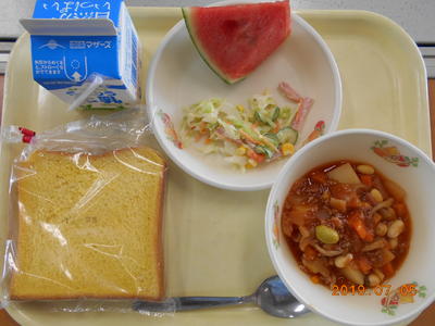 にんじんぱん・チリコンカン・コールスローサラダ・すいか