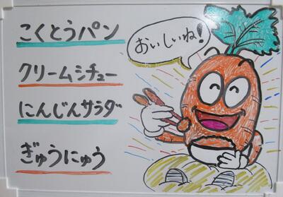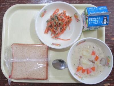 今日の献立は、「黒糖パン、クリームシチュー、人参サラダ、牛乳」です。クリームシチューは、こくを感じる美味しさです。じゃがいも、人参等も食べやすい大きさで、お肉も柔らかく、沢山いただきました。人参サラダは、人参、わかめ、ツナのバランスがよく、沢山いただきました。今週もおいしい給食ありがとうございました。