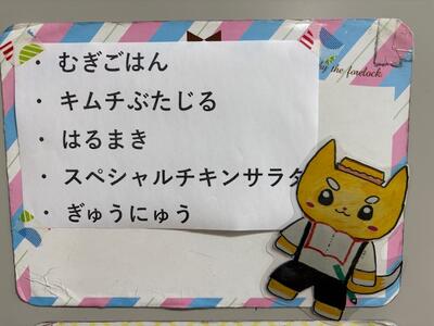 今日の献立は、「麦ごはん・キムチうどん・スペシャルチキンサラダ・春巻き・牛乳」です。今日の天気は少し肌寒く感じましたが、キムチうどんが体をぽかぽかと温めてくれました。スペシャルチキンサラダは、1年生が考えたアイデアを、給食室の先生方が今日も本物にしてくれました。今日もおいしい給食をありがとうございます。ごちそうさまでした。