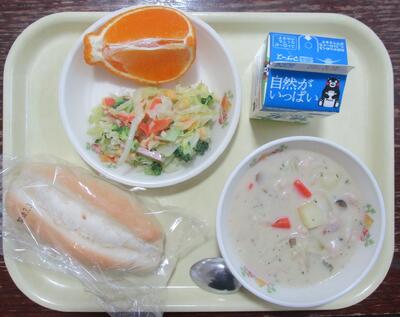 今日の献立は、「ソフトフランスパン、クリームシチュー、ブロッコリーサラダ、しらぬい、牛乳」です。クリームシチューは、まろやかで、じゃがいもも柔らかく、心も体も温まります。ソフトフランスパンともよくあいます。ブロッコリーサラダ、もうすぐ指定野菜になるブロッコリー、栄養満点のサラダです。不知火(しらぬい)甘くてジューシーです。今日もおいしい給食ありがとうございました。