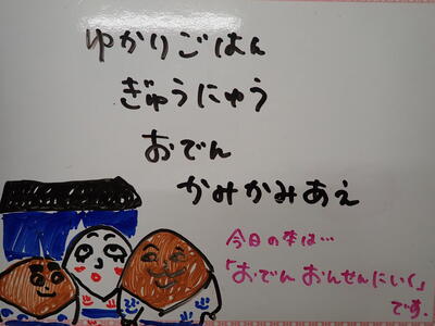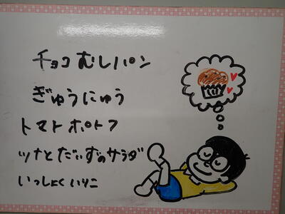 本日の献立ボードには、教頭先生の似顔絵が登場しました。子どもたちは、「教頭先生の顔だ!」と言いながら、しみじみとながめていました。