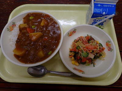 明日から夏休みに入りますので、前期前半の給食は、本日が最後でした。本日のメニューは、「夏野菜のカレー」と「フルーツ和え」で、子どもたちの人気№1の献立でした。