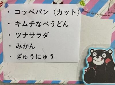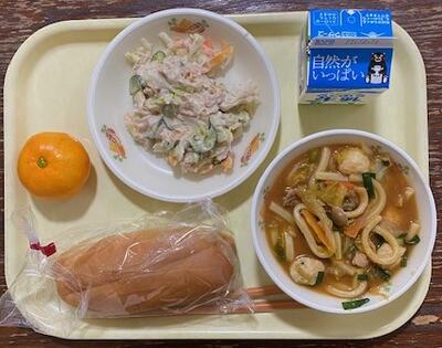 今日の献立は、「コッペパン、キムチ鍋うどん、ツナサラダ、みかん、牛乳」です。キムチ鍋うどんは、うどんが丁度よい柔らかさで、具材も味がしみていて、美味しいです。ツナサラダは、パンに挟んでも、そのままでも食べ応えありのサラダです。みかんもジューシーでした。今日もおいしい給食ありがとうございました。