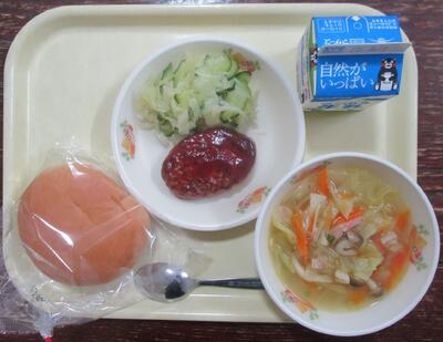 令和8年度、2026年度がスタートしました。今日の献立は、「まるパン、春野菜スープ、ハンバーグ、グリーンサラダ、牛乳」です。春野菜スープは、野菜の美味しさを感じ、柔らかく、ベーコンもよく、味よく、元気の出るスープです。まるパン・ハンバーグ・グリーンサラダは、食感よく、スープと牛乳ともよくあう美味しさです。今年度もおいしい給食ありがとうございます。よろしくお願いします。