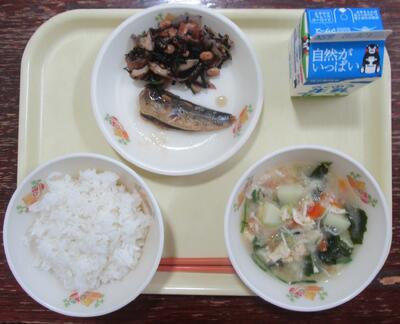 今日の献立は、「麦ご飯、新じゃがのみそ汁、いわししょうが煮、五目ひじき、牛乳」です。新じゃがのみそ汁は、じゃがいもが食べやすい大きさにカットしてあり、ホクホクで美味しいです。いわしのしょうが煮は、ご飯とよくあいます。五目ひじきは、いろいろな味が楽しめます。今日もおいしい給食ありがとうございました。