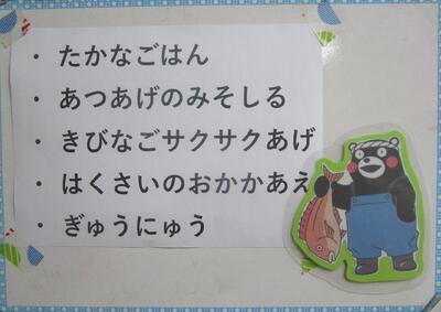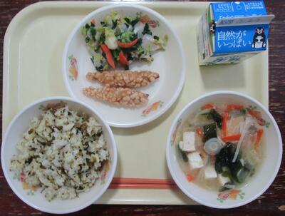 今日の献立は、「高菜ご飯、厚揚げのみそ汁、きびなごサクサクあげ、白菜のおかかあえ、牛乳」です。高菜ご飯は風味もよく、味よく、美味しくいただきました。厚揚げのみそ汁は、具材も多く、食べ応えある美味しいみそ汁で、心も体もあたたまります。きびなごのサクサクあげは、気持ちがよいサクサク感で、美味しいです。白菜のおかかあえは、白菜とほうれん草を沢山いただくことができました。今日もおいしい給食ありがとうございました。