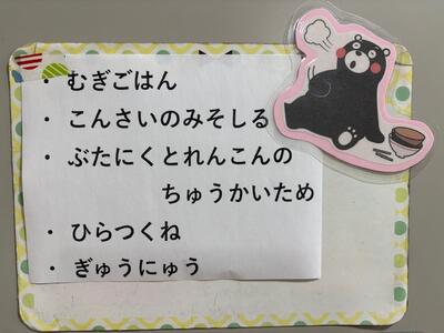 今日の献立は、「黒糖パン・野菜のスープ煮・魚のラビコットソース・牛乳」です。スープ煮はコンソメスープが野菜を包み込んでいて、やさしい味を感じました。ラビコットソースは、フランス料理のソースの一つで、「ラビコット」とは、「元気を出させる」とか「回復させる」などの意味があるそうです。今日も熊本県内には熱中症警戒アラートが発表され、酷暑の一日です・・・。給食が元気の素! 今日もおいしい給食、ありがとうございます。ごちそうさまでした。