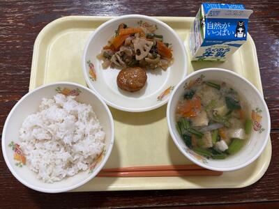 今日の献立は、「麦ごはん・根菜のみそ汁・豚肉の中華炒め・ひらつくね・牛乳」です。みそ汁には、小松菜などの根菜の他に、さつまいもが入っていて、さつまいもの甘さがなんとも言えず、おいしかったです。中華炒めには豚肉以外にもれんこんやピーマンが入っていて、サクサクッとかみ応えも楽しい献立でした。今日もおいしい給食、ごちそうさまでした。
