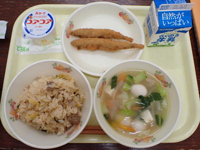 むぎごはん・たまごとわかめのスープ・さかなといものあげがらめ