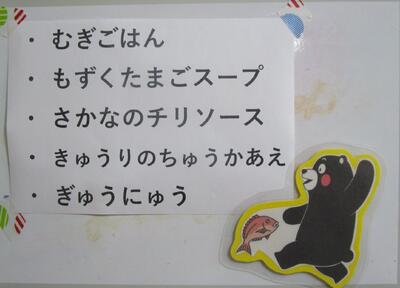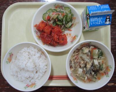 今日の献立は、「麦ご飯、もずくたまごスープ、魚のチリソース、キュウリの中華和え、牛乳」です。もずくたまごスープは、ふわっと、とろっとしていて、美味しいです。心も体もあたたまりました。魚のチリソースは、魚の柔らかさ、ころもにチリソースがしみていて、美味しいです。ご飯もすすみます。キュウリの中華和えは、キュウリの食感がよく、さっぱりしていて美味しいです。今日もおいしい給食ありがとうございました。