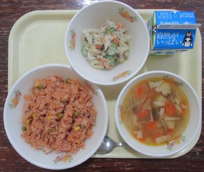 今日の献立は、「チキンライス、コンソメスープ、ひじきサラダ、牛乳」です。チキンライスは、甘酸っぱくて美味しい。コーンやグリンピースもよいです。お肉も柔らかく美味しくいただきました。コンソメスープも具材の旨味が凝縮されていて美味しいです。ひじきサラダも食べやすく美味しくいただきました。今日もおいしい給食ありがとうございました。
