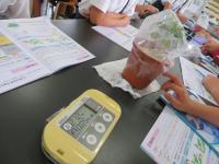 デジタル期待測定器で、植物の取り入れている気体、出している気体を調べている6年生。