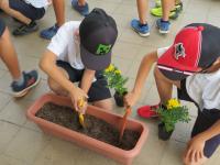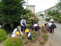 下級生に花の苗の植え方を優しく教えている6年生の姿が素敵でした。