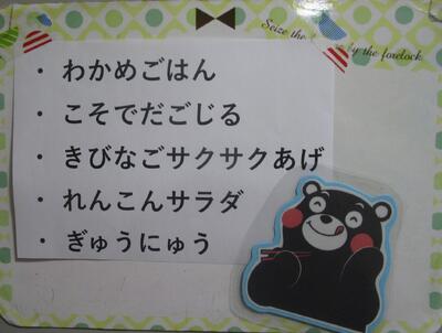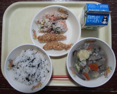 今日の献立は、「わかめご飯、こそでだご汁、きびなごサクサクあげ、れんこんサラダ、牛乳」です。こそでだご汁は、だごが柔らかくて、美味しいです。鶏肉、しいたけ、ごぼう等、味よく、あたたまりました。きびなごサクサクあげは、サクサクッとした食感ときびなごの美味しさが口の中に広がります。れんこんサラダは、れんこんの食感がよく、他の野菜ともよく馴染んでいて食べ応えありのサラダです。今日もおいしい給食ありがとうございました。