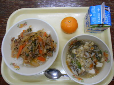今日の献立は、「ぶたキムチ丼・もずく卵スープ・みかん・牛乳」です。今朝も寒さが厳しかったのですが、スープとキムチで、体がほかほかと温まります。みかんは小さくても、甘みがぎゅっとつまっていました。今日もおいしい給食、ありがとうございました。
