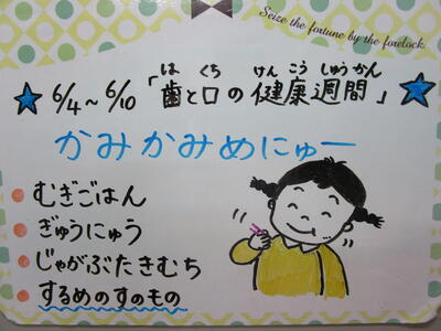 今日の献立は、「麦ご飯、ジャガ豚キムチ、スルメの酢の物、牛乳」です。6月4日~6月10日は、「歯と口の健康週間」で、献立には、★かみかみメニュー★が登場します。今日は、スルメの酢の物、噛むほどに味わい深く、美味しくいただきました。ジャガ豚キムチは、子ども達に人気のメニューでもあります。キムチ風味で、ご飯ともよく合います。今日もおいしい給食ありがとうございました。