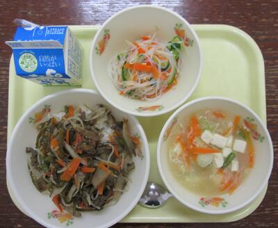 今日の献立は、「きんぴら丼、豆腐のみそ汁、春雨のあえもの、牛乳」です。今日の★かみかみメニュー★は、きんぴら丼です。給食調理の先生方が、ごぼうを1本1本、手作業で笹がきにしたきんぴら丼です。愛情一杯、ご飯ともバッチリでした。今日もおいしい給食ありがとうございました。