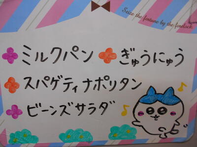 今日の献立は、「おでん・ごまネーズあえ・ごぜん豆・牛乳」です。そして、今日は、菊陽町食育の日としての取組「おにぎりの日」。自分の家から「おにぎり」を用意していただきました。お家のみなさん、早朝からのご協力、ありがとうございました。副菜のおでんも、味がしみて柔らかく、おにぎりにぴったりだったことでしょう。今日も美味しい給食、ありがとうございました。
