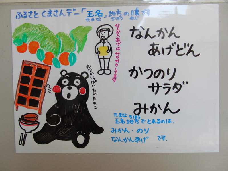 本日は「ふるさと くまさんデー」で、玉名地方の特産物を使った献立が考えられました。「南関あげ丼」は、南関町で古くから親しまれている伝統食品「南関あげ」にダシをたっぷり染み込ませ、卵でとじてあり、大変美味しかったです。「かつのりサラダ」は、きざみのりがアクセントとなっていて、子どもたちにも食べやすく調理してありました。