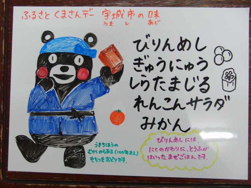 本日は、「ふるさとくまさんデー」で、宇城地区で有名な料理が出されました。「びりんめし」という混ぜご飯を楽しみにしていました。精進料理ということで、肉や魚の代わりに豆腐が入っていて、風味豊かな郷土料理でした。白玉を大事そうに食べている子、れんこんの食感を楽しんでいる子、ミカンを一房ずつ食べている子など、それぞれ楽しみながら食べていました。