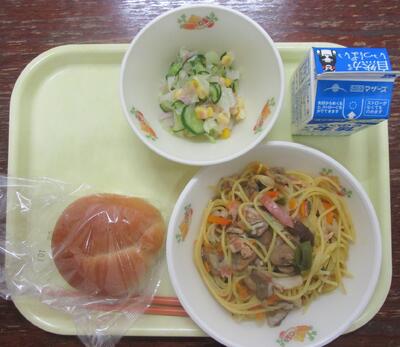 今日の献立は、「チーズパン、きのこスパゲティ、コスモスサラダ、牛乳」です。きのこスパゲティは、きのことベーコンが風味よく、スパゲティも丁度よい感じで、とても美味しかったです。コスモスサラダは、色合いよく、秋を感じるメニューで、食べ応えもあり、沢山いただきました。今日もおいしい給食ありがとうございました。