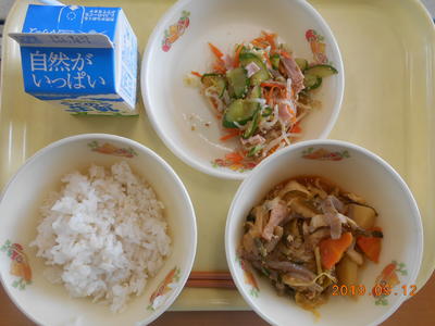 わかめごはん、きゅうきゅうこんさいじる、おさかなのてんぷら、マロニーのあえもの