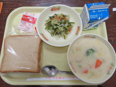 今日の献立は、「ひのくにパン、ビーフシチュー、ビーンズサラダ、牛乳」です。ビーフシチューは、丁寧に煮込んだお肉や野菜の深い旨味を感じるビーフシチューです。お肉は2時間以上煮込んであるとのことで、柔らかい美味しいお肉をいただきました。ビーンズサラダは、いろいろなお豆の食感を楽しみながら、食べ応えありのサラダでした。給食の先生方の愛情いっぱいの給食をいただきました。今週もおいしい給食ありがとうございました。