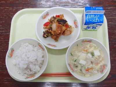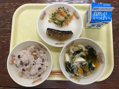 献立のボードを見た子どもたちが、「校長先生の顔だ。似てる。」と話していました。今日の給食は、校長先生の好物が揃っていました。